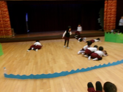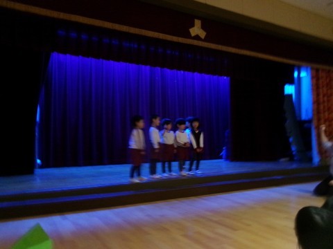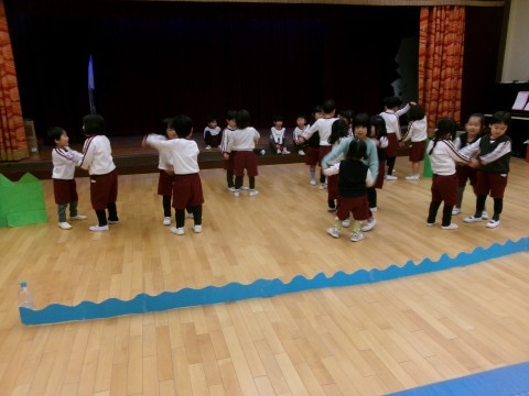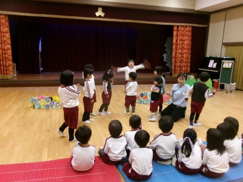 自分が出ていない時は,お客さんになって友だちのカエルごっこを前から見ています。「○○くん,本当のおばけみたいやった!」などと友だちのいいところにも気づく姿がありました。友だちの表現にも目を向けることができるようになってきました!