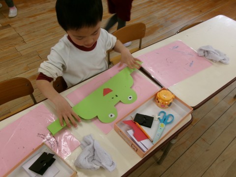 保育室では,カエルのお面をつくりました。午後の自発活動では,つくったことがうれしくて早速身に着けて遊ぶ姿がありましたよ!つけて遊ぶの楽しみだね♪