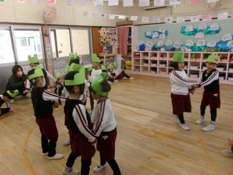 保育室でしゃっきりだけをつくったり,カエルごっこをして遊んだりしました。昨日,他のクラスのお友だちに劇遊びを見てもらって,さらにやる気が出てきた子どもたち。「おうちの人が見に来てくれるの楽しみ!」と次はおうちの人が来てくれることを楽しみに頑張っています!役になって友だちとセリフの掛け合いをしたり,ダンスを元気いっぱい踊ったり楽しみました!