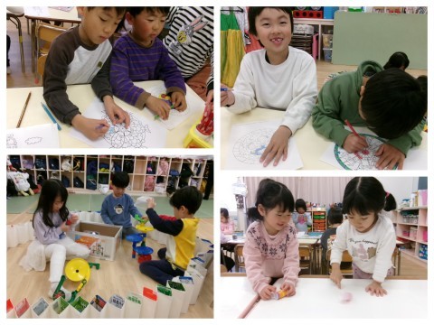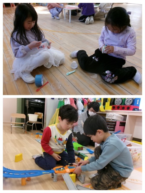 自分たちでコースのラインを引いてリレーをしたり,大縄跳びを何度も挑戦したり,砂場ではおうちごっこやお宝探しなどなど