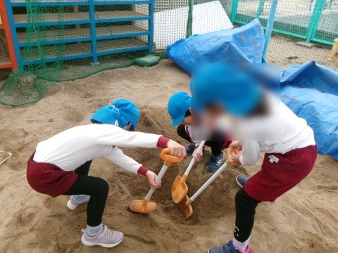 砂場では「たんけんたいごっこしてるねんで~」と子どもたちが穴を掘っています。