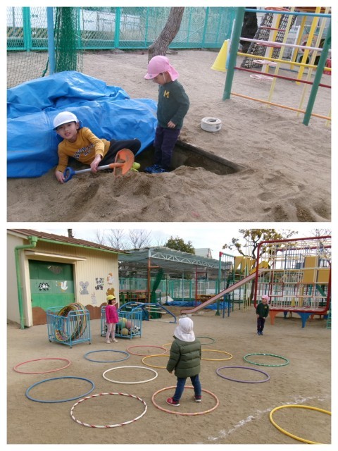 異年齢混合のリレーやフープを使っての色鬼ごっこ,砂場では探検ごっこなどなど外遊びを満喫したようすでしたよヾ(≧▽≦)ノ