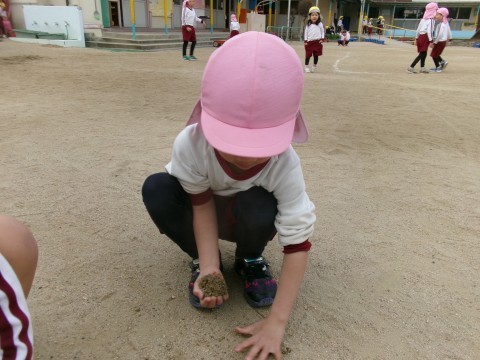 「みてー!いっぱい拾ったよ!」と見てみると,手のひらいっぱいにクロガネモチの実を集めていました。「○○ちゃんにあげるねん!」とお料理をつくっている友だちにプレゼントしに行く姿もありました。泥団子をつくって楽しむ子どもたちは,「ここの砂がサラサラやからいいねん!」とサラサラの砂があるところで,砂をかけて固める姿がありましたよ。泥団子をつくるのも上手になってきました😊