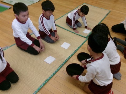 これまでは,お菓子・お茶ともにいただいていましたが,次回の「茶の湯体験」では,子どもたちもお菓子を運んだり,お茶をたてたりする予定です。今日はその前に,みんなで雰囲気を楽しみました。
