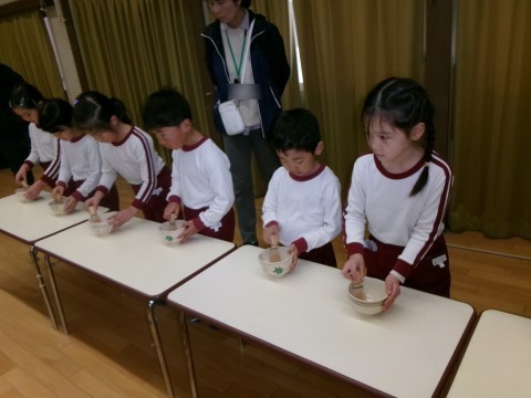 茶筅をもってお茶をたてることがうれしくて,にこにこしながら取り組んでいましたよ。