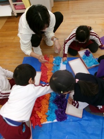 壁面に飾ると「虹がかかった」「すごい!」「動物たちが歩いているよ!」と想像を膨らませていました!
