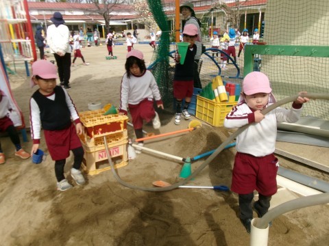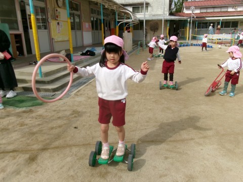 自発活動では,バランスカーに乗ったり,砂場でホースやビールコンテナなどを使って遊んだりして楽しんでいました。砂場で遊んでいる子どもたちは,「斜めにしないとホースの水が流れない!」とホースを斜めに持ってみたり,台に置いてみたりといろいろと試しながら遊んでいました。