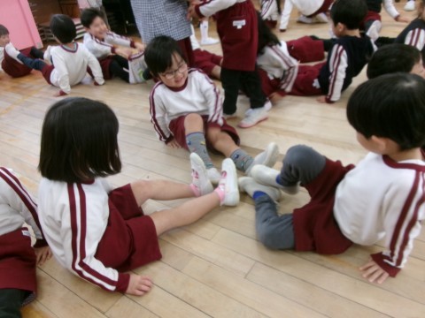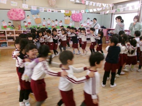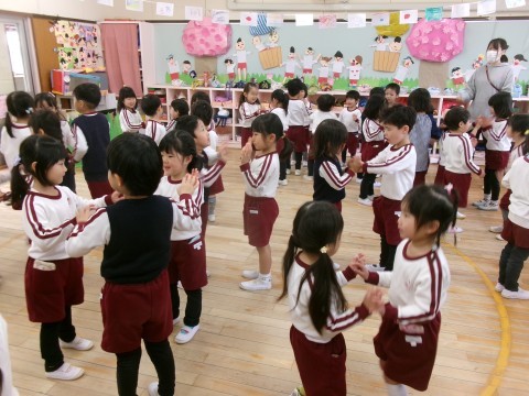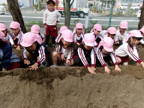 保育室では,たんぽぽ組さんとふれあい遊びをして楽しんだり,昨日みんなで準備した種イモを畑に植えたりしました。ペアになって,自己紹介をしたり,ジャンプをしたり,なべなべそこぬけをしたりといろいろなことを楽しんで,仲良くなりました♪