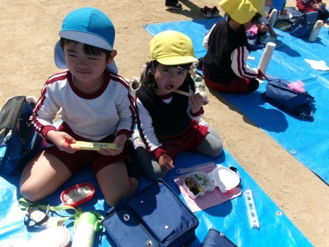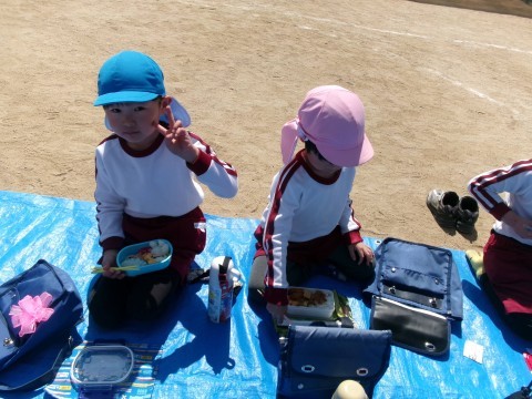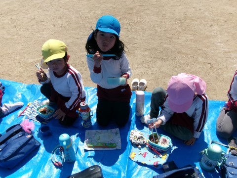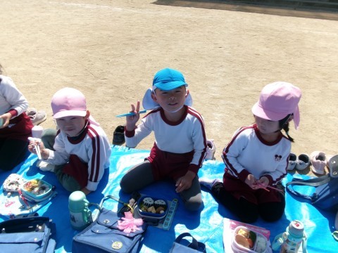 そら組が幼稚園で弁当を食べるのは今日が最後。園庭で,うさぎ組さんやたんぽぽ組さんと一緒に弁当を食べました。