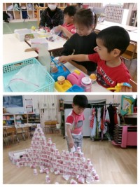 お友だちとオリジナルのミニ絵本やシール帳をつくったり,紙バネを何個も作ってびっくり箱やパソコンを作ってみたりする様子が見られるようになってきたばななルーム🍌