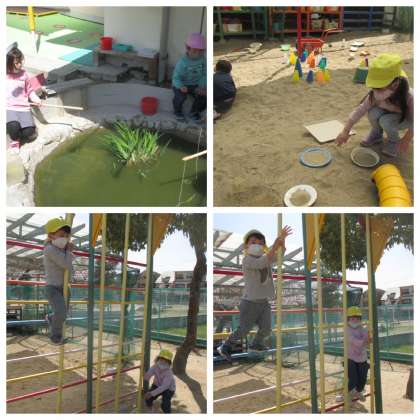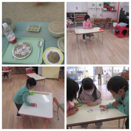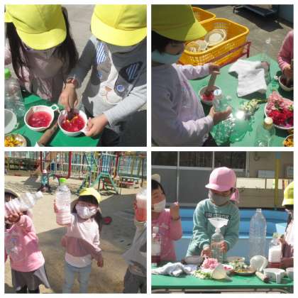 素敵な色水ジュースができ,砂場では桜のランチ会。