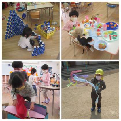 新聞紙や折り紙で,魔法のスティックを作ったり