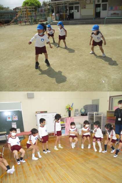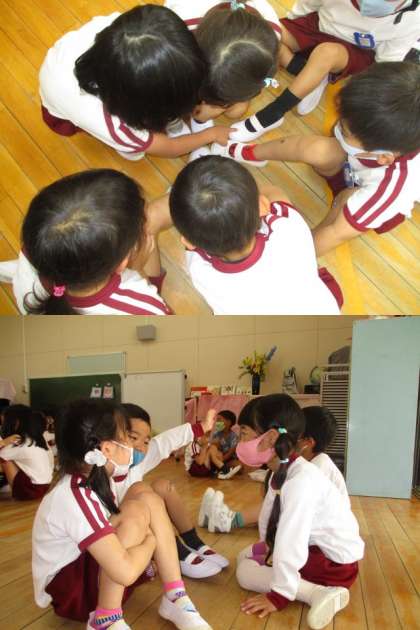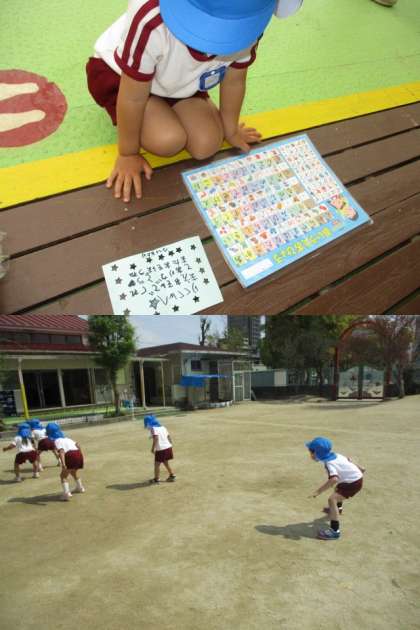自発活動の時間には,お友達からお手紙をもらい「なんてかいてるんやろう?」とあいうえお表を見ながらお手紙を読んでいる子どもの姿がありました。郵便屋さんごっこをしている子どもたちだけでなく,お手紙をもらった子どもたちも文字に興味や関心をもつきっかけになっています!お片付けの後には,お部屋までケンケンパーでいけるか挑戦!!職員室前からお部屋の前までの距離をみんな一生懸命ケンケンパーをしていました。