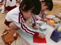 部屋では、昨日描いた、さんびきのこぶたの絵にコンテで色を付けています。はじめてコンテを使うので、色が広がることがうれしくて、何度もこすっている子どももいました。かわいいこぶたたちの絵ができあがりつつあります!