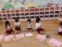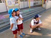 砂場では穴を掘ったり、「穴を隠そう!」とシートを広げたりして、落とし穴づくりをしましたよ。友だちと遊びに何がいるのかを話しながら、楽しんでいました。「先生を落とす!」と意気込んでいる子ども達の穴を掘りを私も一緒に手伝って遊んでいることに、「ん?先生を落とすの??自分の落ちる穴を掘っている!!」と子どもと話しながら・・・一緒に遊びを楽しみました!
