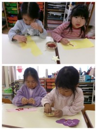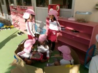 部屋では、かえるの絵本を読みました。「かえるになってピクニックにいこう!」「でもへびが出てきたら、こわいなぁ・・・」「携帯電話(自分でつくったもの)にへびさんから電話がかかってきたよ!!」とごっこ遊びがはじまっています。「お面をつくろう!」「私はへびがいいな」「かえるになりたいなぁ」と楽しみにしている子ども達です。いろいろなイメージを広げたり、つなげたりしながら、みんなでごっこ遊びを楽しんでいきたいと思っています。
