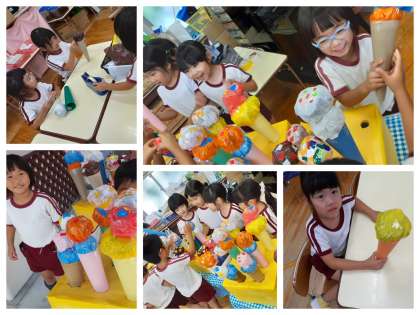 この頃、毎日とっても暑いので、そら組に「アイスクリームやさん」が登場しました。チョコレートやソーダ、ダブルにトリプル・・・。いろんな味のおいしそうなアイスクリームがどんどん出来上がってきました。