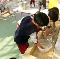 今日はソーランを踊っている姿を描きました。「外で踊ったら、ハッピが風でブワーって広がるで」「ちょっとズボンも見えるねん」など、自分たちが踊っている姿を思い出したり、踊っている写真を見たりしながら描いていました。鳴子を描く際には、自分のそばに鳴子を置いて集中して描く姿も見られましたよ。