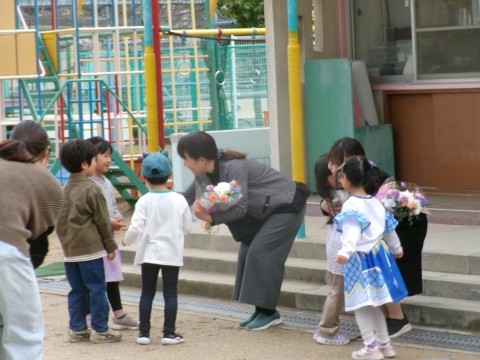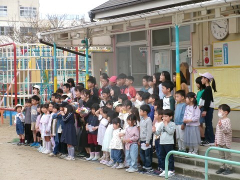 式後には,PTAさんのお計らいでたくさんの卒園児や保護者の方々がお別れにかけつけてくれました。