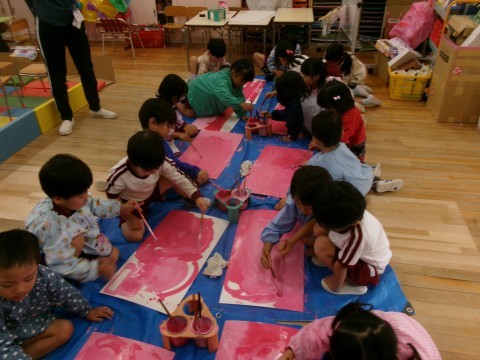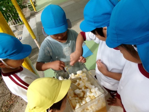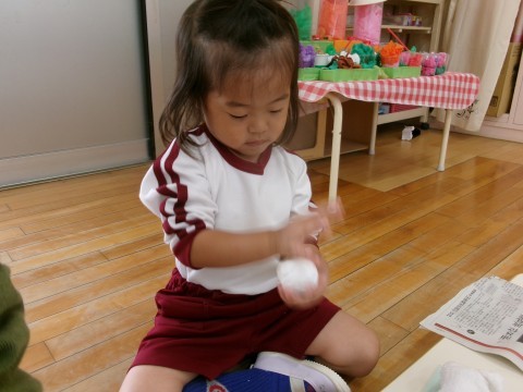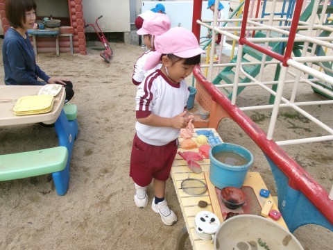 テラスでは「これを使ったら何ができるかな?」とお試し中の子どもたち。水と絵の具を混ぜたものに,緩衝材をいれてみると・・・・。思っていたように色が着かないなあと困っていると,たんぽぽ組さんもやってきました。そして,年少組の先生に「これを入れてみる?」と声をかけてもらって,たんぽぽ組のお友達も一緒にチャレンジしていましたよ。予想とは違っていても,いろいろと試してみるのは楽しいね!さてさて何ができるのかな?
