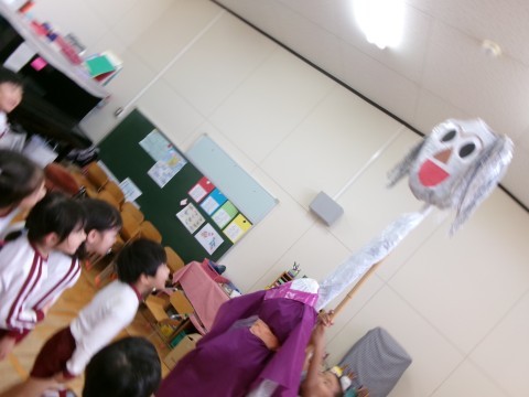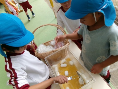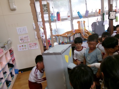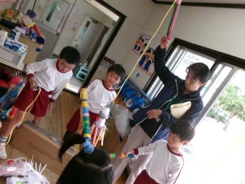 つくってあそぼう!!ということで,今日はつくったもので遊んでみましたよ。おばけはどうやって動かそうかな?もっと怖がらせたいな~など,自分たちで楽しむだけでなく,お客さんのことも意識して考えるようになってきましたよ。廊下では「イカ釣り」を楽しんでいました。釣り竿も自分たちでつくりましたよ。それぞれの「やりたい」気持ちを大切にしながら,遊びが広がることを願っています。