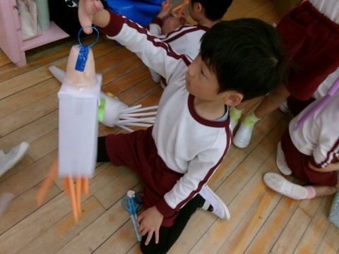 園長先生からのお楽しみは,ペーパーの芯やストロー,輪ゴムを使った飛ぶおもちゃ✨みんなの頭を通り越して飛ぶ様子に,大歓声が起こりました。