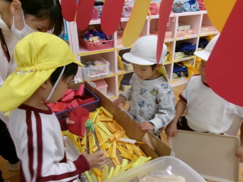 「画用紙でつくる!」「毛糸にしよう」など,経験から少しずつ何でつくったらよいのかを考えている子どももいます