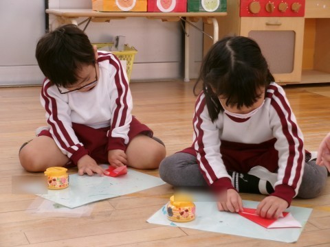 全体で折り紙をするのは3回目なので,折り目をつけて,しっかりと折すじをつけるところをがんばっていました