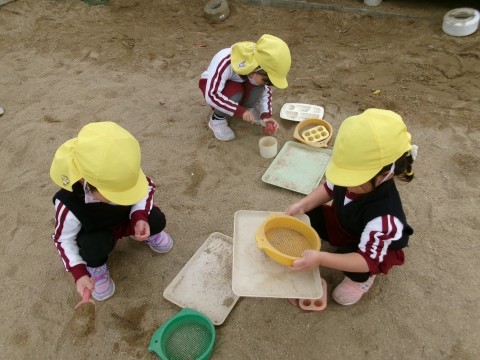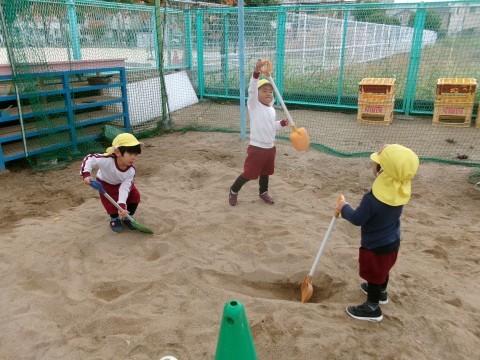 外遊びでは,縄跳びやボールで体を動かして遊ぶことを楽しんだり,ごっこ遊びで戦う時に必要なものやお家をつくったりといろいろなことを楽しんでいます。縄跳びでは,「6回も跳べてん!」「僕は,8回!」と練習して跳べるようになったことを喜ぶ姿がありました。
