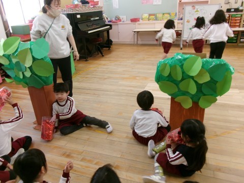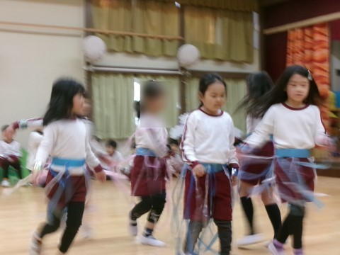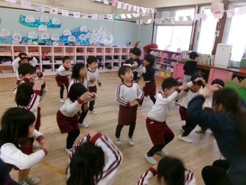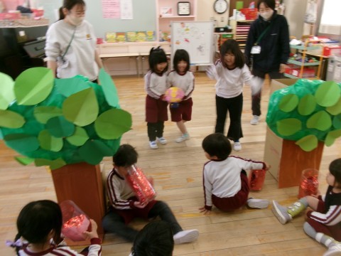 今日は,節分の日ということで炒った豆を折り紙でつくった箱の中に入れ,豆まきをみんなでしました。豆を炒っていると「豆のにおいがしてきた!」とにおいを楽しむ姿がありました。「おにはそと!」「ふくはうち!」と声に出しながら豆をまく姿がありましたよ。本当に鬼がやってきたので,「こわかった。」と言っている子どももいました。鬼を追い払った後には,福の神が出てきてくれましたよ😊