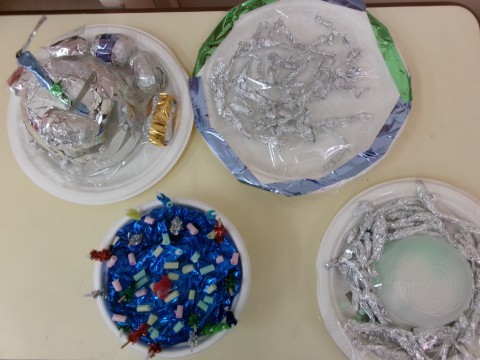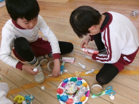 劇遊びで使う道具が次々に出来上がり,劇遊びを盛り上げます。