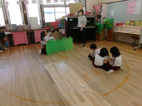 おおかみが部屋に入ってくるところや,子ども達が隠れるところ,お母さんたちに助けてもらうところを遊びました