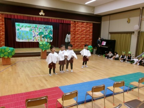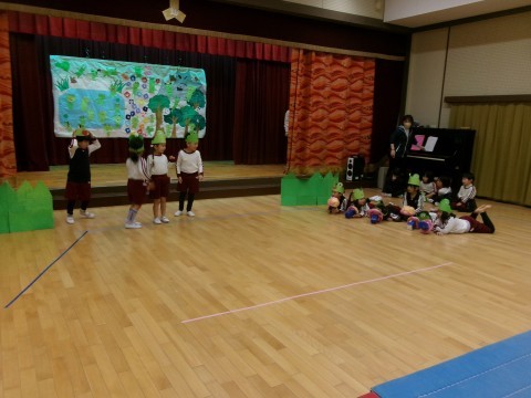 友達と歌を歌ったり,手遊びをしたりして,普段の遊びをたくさん楽しみながら,子ども達がげきをつくってきました