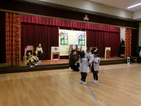 友達と歌を歌ったり,手遊びをしたりして,普段の遊びをたくさん楽しみながら,子ども達がげきをつくってきました