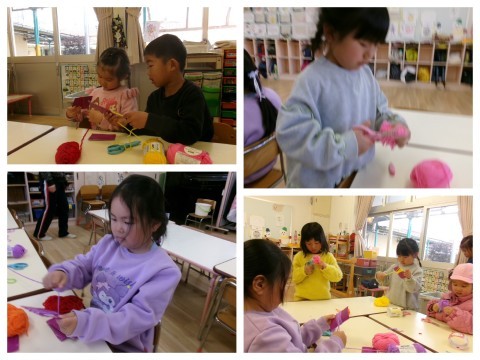 年中さんは「好きな毛糸を決めてぐるぐる巻くんやで」と年長さんに教えてもらいながら挑戦していましたよ💕