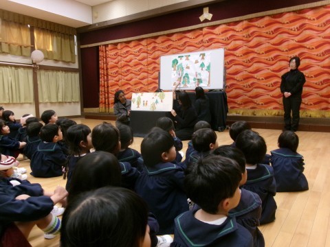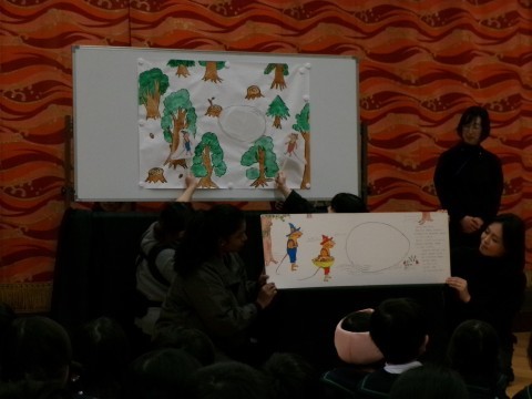 PTA絵本委員の保護者の方々に,遊戯室で「ぐりとぐら」のお話を聞かせてもらいました