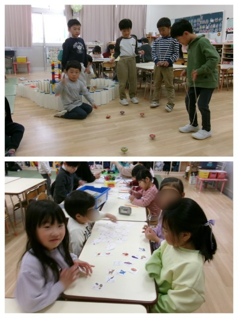 お部屋ではコマ回し大会やカルタ大会など好きな遊びを楽しんだ子どもたち(*^▽^*)