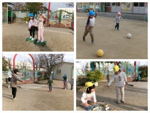 春の兆しを感じながら,子どもたちは一輪車や鬼ごっこトンネル掘りを楽しんでいました。