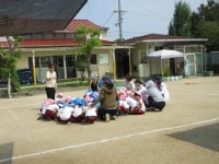 少し大きな地震がきたという設定で行いました。園庭の子どもたちは広い中央へ,お部屋...