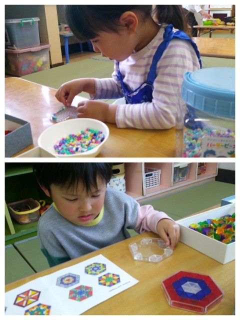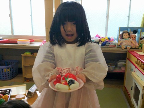 着替えの後は、ままごとで遊ぶお友達やビーズを並べて楽しむお友達の姿が見られました。ビーズで作るときは見本と同じようにしてみたり、自分なりにちょっと色を変えてみたりとそれぞれが考えて作っていました!今日はとても暑かったのでお友達がアイスを画用紙で作って人形や友達、先生にも渡していました。ごちそうが次々とでてきて、もらったお友達は笑顔がこぼれていました♪
