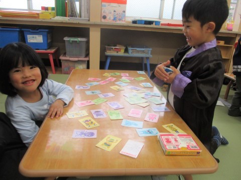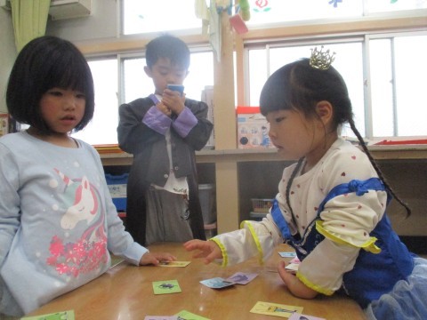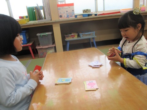 モンスターの特徴をきいて取るカルタのようなゲームはやればやるほど楽しいですね!「わたしもいれて!」と楽しそうな様子から参加するお友達もでてきました。はじめての参加でも「はい!はい!」と次々カードをとっていきます。気づけばお互いに集中して遊ぶ姿が見られました。最後は「いーち、にー・・・」と一緒に数を数えきって楽しみました。ヒントを出すお友達も聞いているお友達もそれぞれやってみたいことをみんなでするって楽しいね!今度は先生も負けないよ!