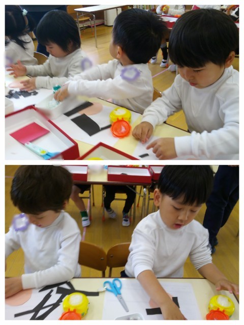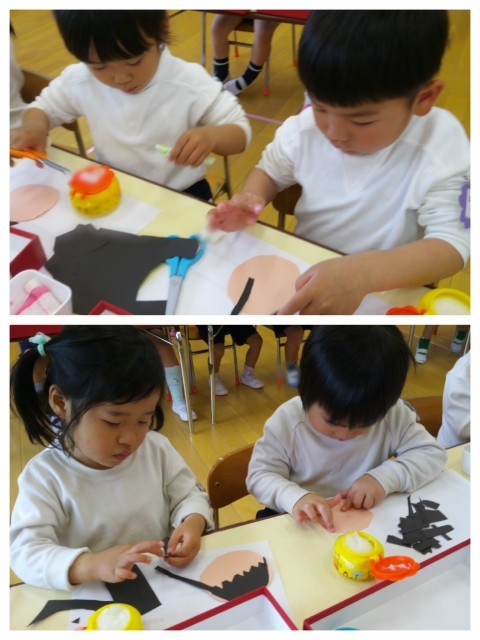 今日はお着替えも早く出来たさくら組さん。心配されたお天気もなんとか降らずにいたので園庭で遊んでいたのですが…なんと☔☔☔‼少し早くお部屋に戻り朝の会をした後は昨日の続きをしました。昨日はお顔の形を切っただけでしたが、今日は髪の毛を切って貼ったり、目を作りました(^▽^)みんなお話しを聞いて「髪の毛長すぎる~」「お口の中のベロ作る~‼」と話しながら頑張って仕上がりました✌さくら組になって初めての、のり製作。 一生懸命に頑張っていましたよ(^▽^)/
