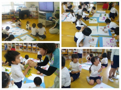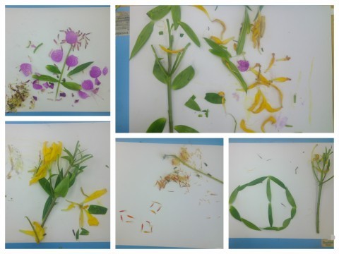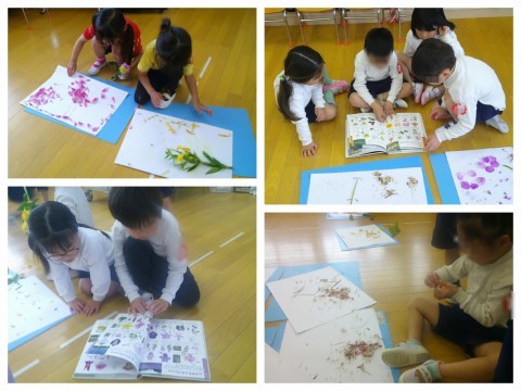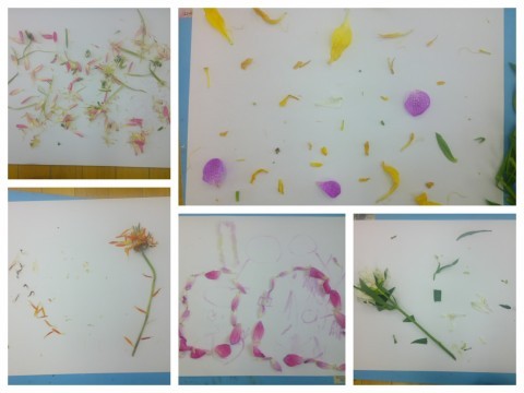 その一方で、花びらや葉を画用紙の上に並べて楽しんでいる子の姿も・・・それを見た友達から「おもしろそう!」「僕もやりたい!」という声が挙がり始めたので、最後にみんなで好きなように並べて楽しみました。一人ひとり、とってもこだわって並べていたのですが、一つ一つが軽いので、子ども達が少し歩き回っただけでも風が吹いて動いてしまいます。「写真に撮って残そう」と写真に撮った後、「色水あそびやままごと使おう」「虫のエサにしてみよう」と一人ひとり使い方を考えながら片付けました。たった1輪の花でも、子ども達にとっては大発見がたっぷり詰まった素敵な教材です。これからもいろいろなことに興味をもっていってほしいと願っています。
