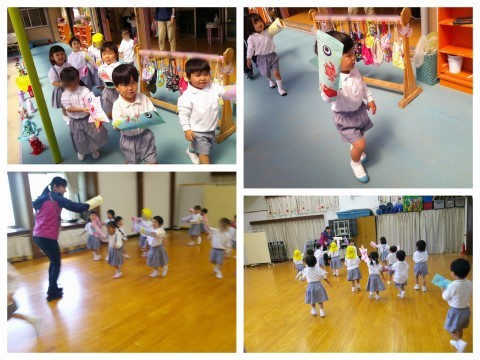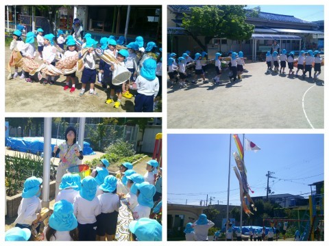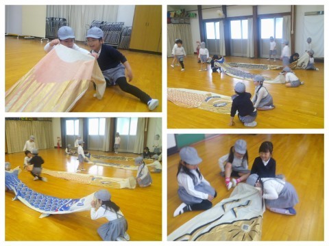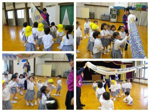 降園前には遊戯室で鯉のぼりと一緒に遊びました。「大きいなあ」「ツルツルやなあ」と触ったり、頭と尾からそれぞれ顔を覗かせて、向こう側の友達と「おーい」と声を掛け合ったりして遊びました。「ふくらんでないから飛ばれへんなあ」「雨がやんだら外で泳がせてあげよう」と言っていたので、明日はお空に泳がせてあげたいと思います(^▽^)