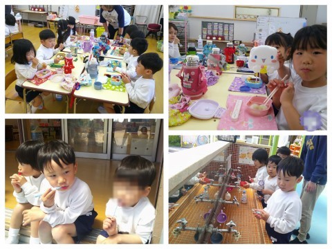 お弁当時間になり、みんなで一緒に《♪お弁当の歌》を歌い ご一緒に「いただきます」をしました。みんなで一緒に食べれて嬉しそうにしていた子ども達、明日も全員ピカピカさんになりたいな(*^^*)その後のハミガキでは園長先生にも見てもらい、園長先生も「みんな上手に出来ているね」とみんなのことをほめていましたよ!(^^)!明日も頑張ろうね!