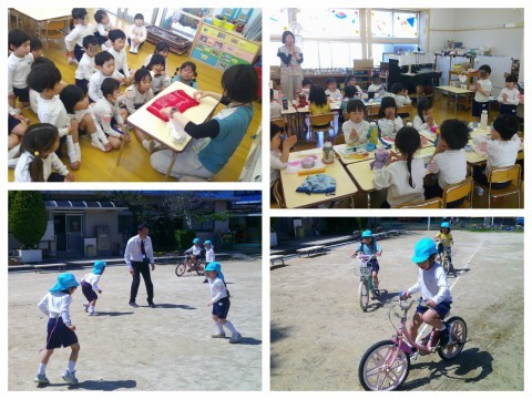 すみれ組になってから初めてのお弁当も、さくら組での流れをしっかり覚えていて、準備も片付けも自分達で声を掛け合いながら取り組んでいました。4月になってからは、朝の自発活動の時間は小さいお友達もたくさんいるので、自転車に乗るのは控えてもらっています。弁当後の園庭遊びでは、久しぶりに自転車に乗り嬉しそうな子ども達もいました。久しぶりの午後保育でしたが、天候も気持ちよく、あっという間に降園時間となりました。また明日、元気に登園してくださいね♪