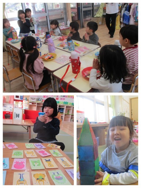 園庭あそびを楽しんだ後は、保育室に戻ってきて、グループの名前を決めたり、誕生表に使う自分の顔を作ったりしました。先日の当番表用に描いた自分の顔をそうでしたが、一人ひとり、作った顔がみんなそっくりで、とても愛らしかったです(^▽^)明日は身体を作ろうね、と話しています。
