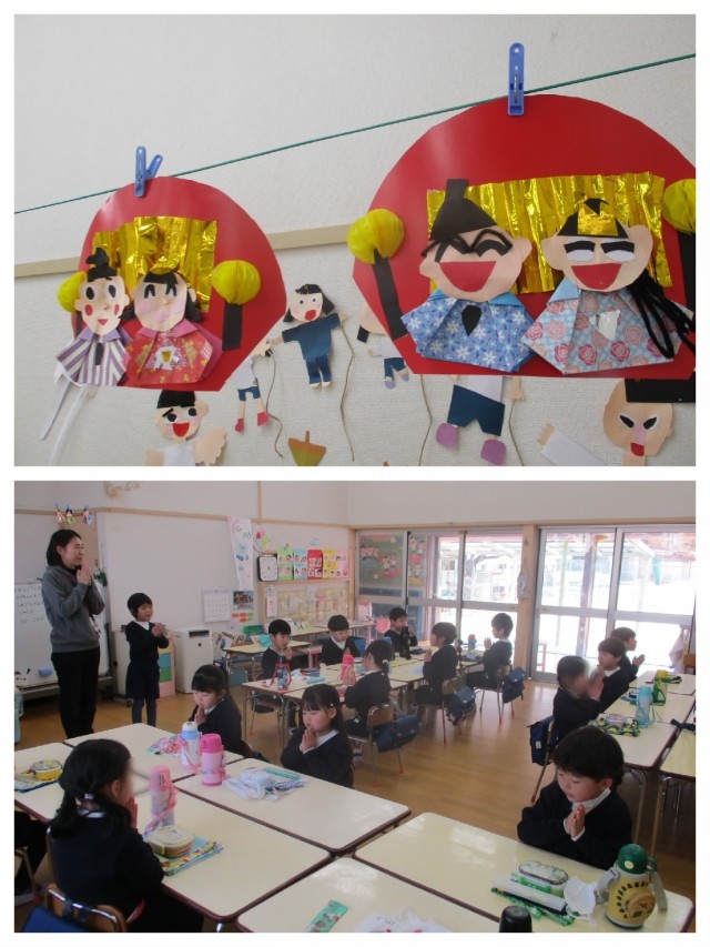 昨日の小学校との交流から刺激を受け、今日も小学校ごっこで1日が始まりました。そして雛人形飾り制作の続きをしました。今日は「後ろにきんきらのカーテンみたいなのがある!」「電気がある。ぼんぼりや!」と、みんなで飾りを作りました。両面テープもばっちり使いこなせるようになっています✌金の屏風とぼんぼりを一緒に飾ると華やかに可愛くなりました(*^▽^*)