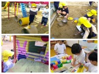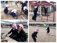 今日は待ちに待った玉ねぎ収穫でした。「さくら組で植えた時は、細いネギやったのにね」「植えた時は玉がついてなかったのに、不思議やね」と話していた子ども達。園庭に出る前に「どこを持って抜いたら良いと思う?」と尋ねると、「ネギがちぎれないように、下の方を持ったら良いと思う」「上の方を持たないと力が入らないと思う」といろいろ予想していました。一度自分の思うようにやってみよう、と収穫に挑むと、ブチッとネギがちぎれてしまう子も。「やっぱり下の方持たなあかんなあ~」と自分なりに考えて取り組んでいました。