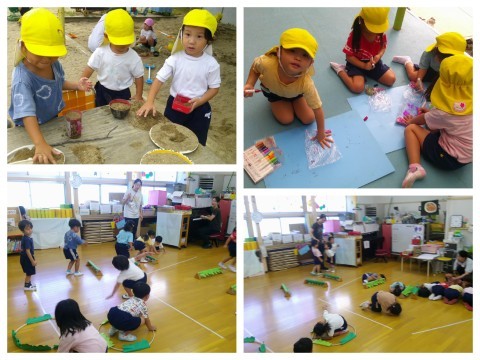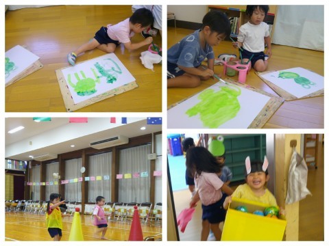 「今日は、カエルごっこいつするの?」と、カエルごっこが大好きな子ども達。保育室で遊んだ後は、絵の具でカエルの絵を描きました。「お母さんカエルと子どものカエル」「お友達も描いたよ」「見て、手つないでるねん」と、これまで遊んできた思いが絵やつぶやきにもあらわれていましたよ♪